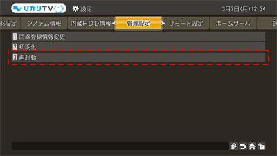 [手順2] リモコンの「ホーム」キーを押してホーム画面に遷移した後、設定画面の「管理設定」にある「再起動」からチューナー再起動を行ってください。なお、「管理設定」内の「再起動」は、シークレットモードをオン(画面右下の鍵マークを開いた状態)にしていただくことにより表示されます。シークレットモード暗証番号の初期値は、取扱説明書をご確認ください。
